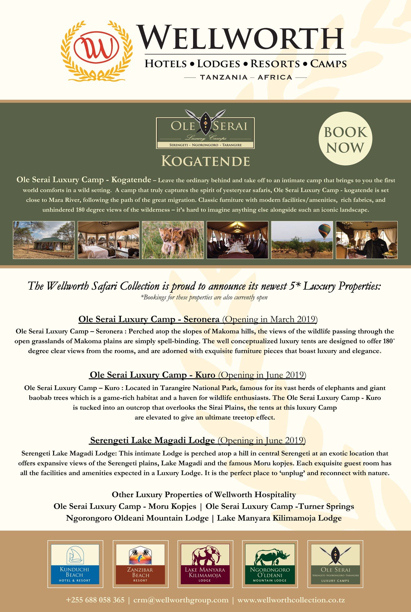 Mit dem neuen Ole Serai Luxury Camp Seronera hat die Wellworth Collection das mittlerweile 4. Ole Serai Zeltcamp in der Serengeti im März 2019 eröffnet. Die Arbeiten der neuen Serengeti Lake Magadi Lodge in der Zentral-Serengeti laufen planmäßig und sollen Anfang 2020 abgeschlossen sein. Ebenfalls Anfang kommenden Jahres soll das Ole Serai Camp Kuro im Tarangire National Park eröffnet werden und ergänzt den rasant wachsenden Safari Circuit der Wellworth Collection weiter. Weitere Camps und Resorts sind in Planung und werden 2020 eröffnet.