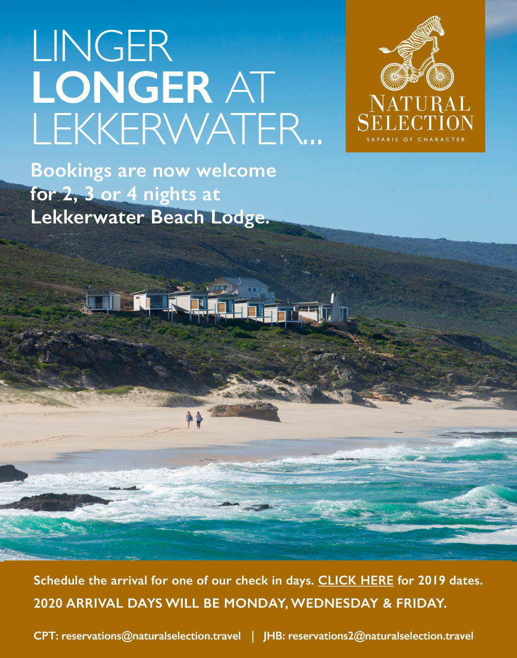 Die neu eröffnete Lekkerwater Lodge im De Hoop Naturreservat bietet ab sofort längere Aufenthalte als den Mindestaufenthalt von 2 Nächten an. Gäste können also so viele Nächte wie gewünscht bleiben, nur die Anreisetage sind aus logistischen Gründen festgelegt – siehe unter diesem Link.