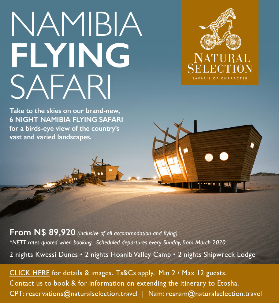 Natural Selection offers a great fly-in package for accommodation in Namibia up from March 2020. After the opening of the newest lodge Kwessi Dunes, guests can experience this spectacular flying safari. For 6 or 8 nights guest travel on short flights over the breathtaking Namibian landscape and experience unique accommodations. The first two nights in Kwessi Dunes before flying over the vast Namib Desert for breathtaking views of the towering dunes of Sossusvlei. It continues with a short stopover for a beach-lunch in Swakopmund, along the Atlantic coast into the interior you reach the Hoanib Valley for another 2 nights. Leave the plane for a spectacular drive to the Skeleton Coast, where you spend for two nights at the award-winning Shipwreck Lodge.